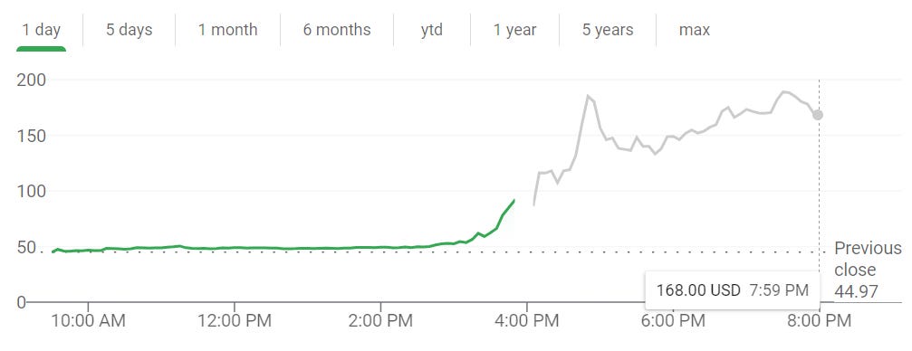 Sure, yeah, why not? Having staggered around for a week or so at $45-50/share refusing to die, GameStop (GME) stock suddenly and explosively quadrupled in price towards the end of close and during after hours trading.