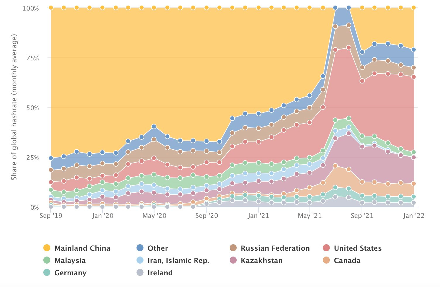 The Cambridge Bitcoin Electricity Consumption Index (CBECI) is the most reliable and objective overview of what we know about the Bitcoin mining network. They just released an update to their estimates of the geographic distribution of miners. Chinese mining dropped briefly to zero after the government banned mining, but underground mining seems to have resumed and Chinese miners now account for ~20% market share. The data does have limits — Germany and Ireland for example actually have very few Bitcoin miners locally but mostly show up as a result of miners who use VPNs.