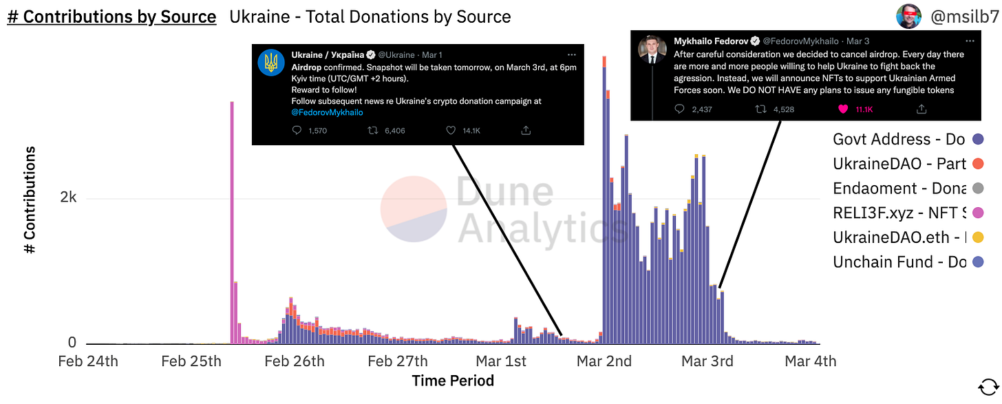 As you can see from the graph at the top of the section donations to the government (the blue bars) tapered off relatively quickly after tweeting the address but then ticked back up again on March 1st when rumors started circulating that Ukraine was going to airdrop a token of some kind (akin to the PEOPLE, ENS or LOOKS tokens). Late that evening Ukraine confirmed the rumors were true — an airdrop was coming: