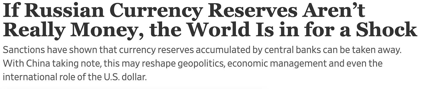 Debt is a liability: someone has to pay it back to you. That requires a minimum level of trust, which tends to break down in time of war. No one wants to repay you if they suspect you will use the money to kill them (or their allies). So when Western sanctions cut Russia off from the global economy it also cut off access to their foreign currency reserves. That’s obviously pretty bad for Russia but (perhaps less obviously) it is also pretty bad for the US dollar.