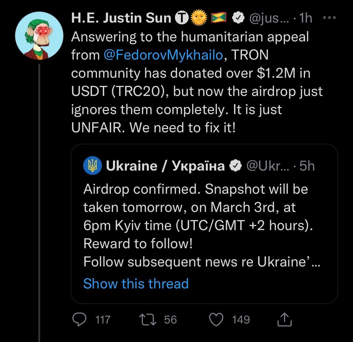 Suddenly spurred on by the prospects of free money, "donations" surged. More genuine donors appeared, but also a host of exploiters donating a tiny amount from dozens of different addresses to farm the airdrop — ultimately paying more to miners than they donated to Ukraine. The airdrop was planned for Ethereum, which gave Justin Sun of Tron the opportunity for a breathtakingly bad tweet: