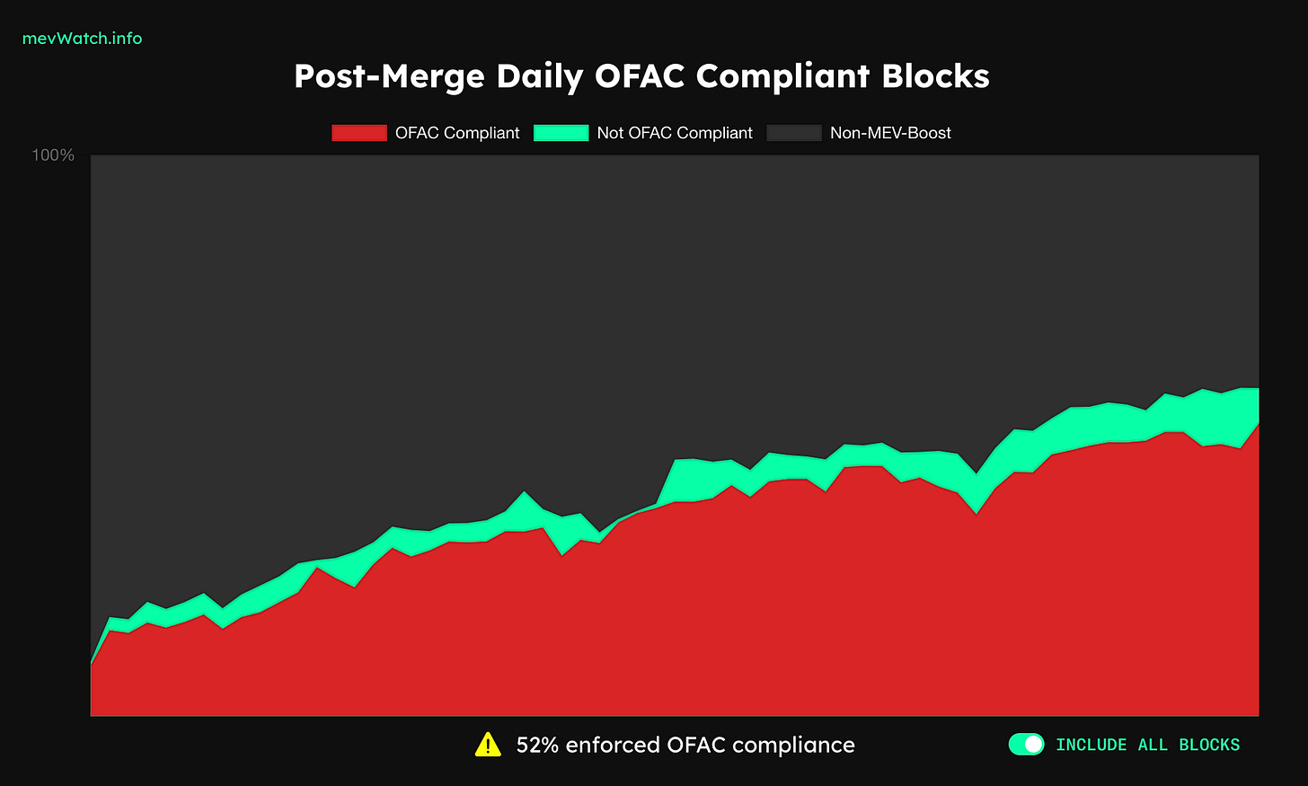 We’ve talked before about how the economics of MEV on Ethereum centralize the network: increasingly specialized skill is needed to extract the most potential value from block creation, which means more and more blocks are being created by a small group of specialists. Since those specialist companies are based in OFAC compliant territories the Ethereum blockchain is increasingly being dominated by OFAC compliant validators. At time of writing 53% of Ethereum blocks are OFAC compliant. If those validators decided to stop attesting to non-compliant blocks they would be evicted from the network. Arguably the US government has de facto control over Ethereum right now.