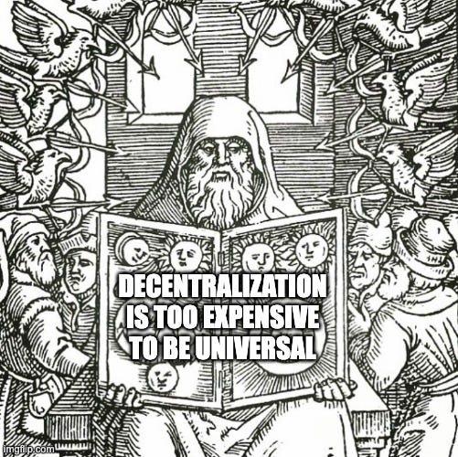 If you believe in the value of decentralization it is easy to see why you would want everyone to have access to it. But if you understand how decentralization works it is also easy to see why that will never be possible. The math simply does not allow it. Even in a world of hyperbitcoinization, true self-custody will remain an extraordinary privilege that most people will never be able to afford. This is a descriptive statement, not a proscriptive one. The cost of decentralization is like the force of gravity, it is neither good nor evil, it simply is. It exists on the other side of the guillotine.