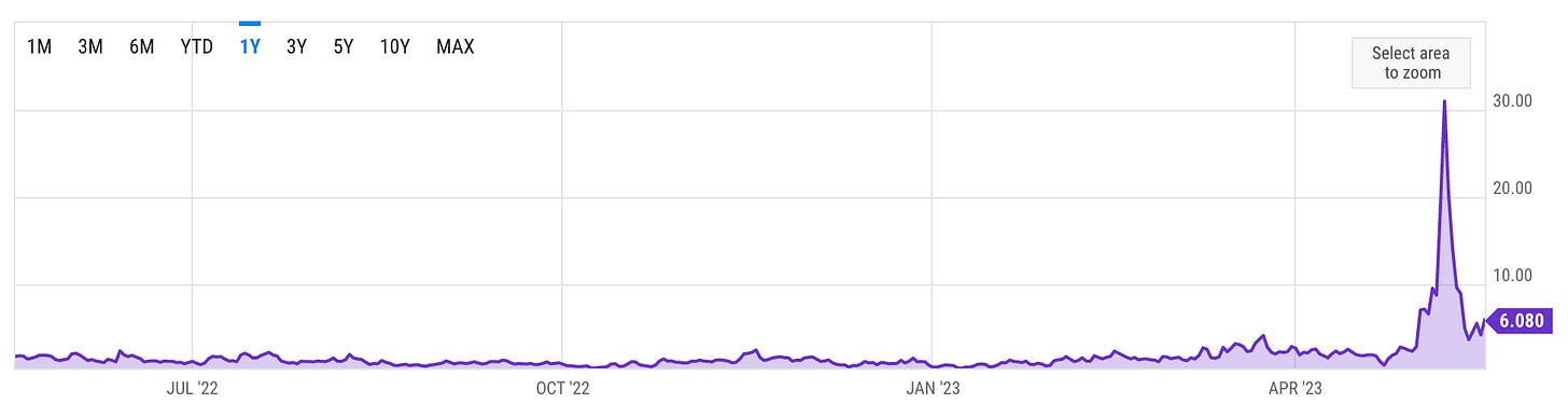 The main reason for this spike in transaction fees is the launch of several "BRC-20"3 tokens that used inscriptions to create meme-coins on Bitcoin. Good news: Bitcoin finally found product market fit! Bad news: the killer use case for Bitcoin turned out to be shitcoins after all. Life comes at you fast.