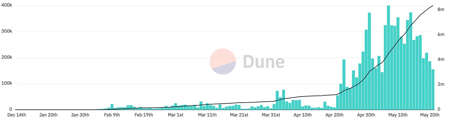 As of writing ordinal transactions have spent ~$39M on transaction fees. In fact on May 7th Block #788695 became the first block in Bitcoin history that paid the miner more in transaction fees (6.7 BTC) than in block rewards (6.25 BTC). Average transaction fees were the highest (in USD) that they have been since the bubble in 2021 when bitcoin was trading for ~$69k/BTC.2