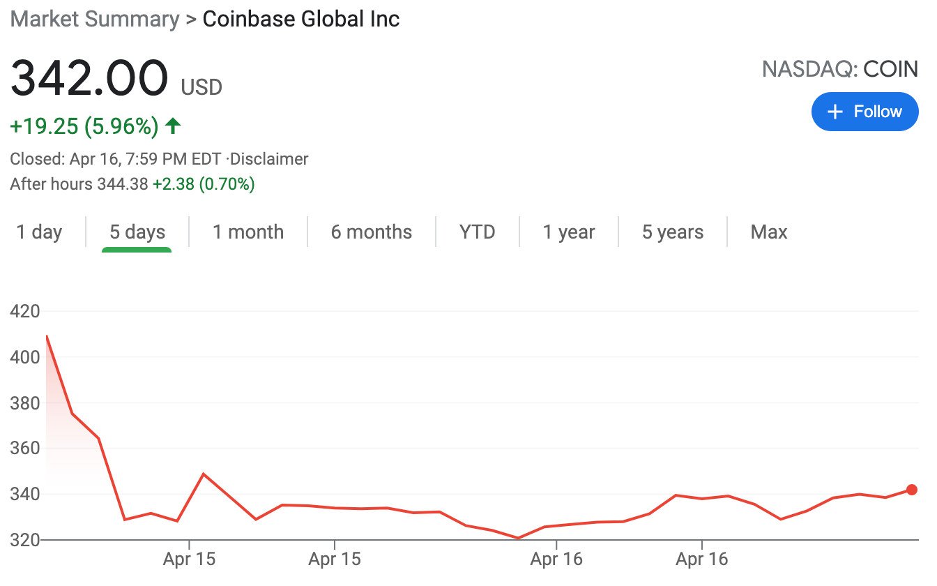 There isn’t any way to really know why people started selling, but personally I blame Coinbase.1 Much of the world is likely using COIN as a proxy for the success of Bitcoin (and other cryptocurrencies). When it launched to reasonable but not spectacular performance the market was disappointed and prices sagged.