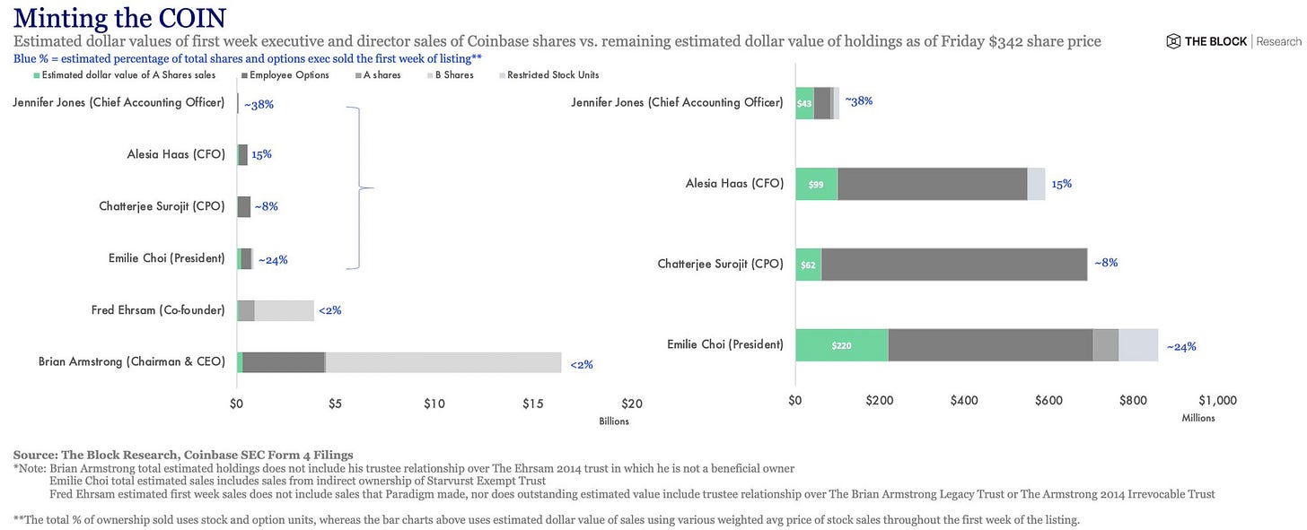 The simple answer of course is that there were more sellers than buyers. I speculated that Coinbase might still have lockups preventing insider sales in spite of the fact that they did a direct listing, but in this case I was mistaken - several readers reached out to let me know anecdotally that people they knew who work at Coinbase were able to (and did!) sell their equity.2 Even more prominently, the paperwork that Coinbase is now obligated as a public company to file revealed a lot of equity was sold by senior Coinbase management: