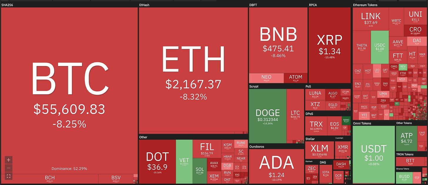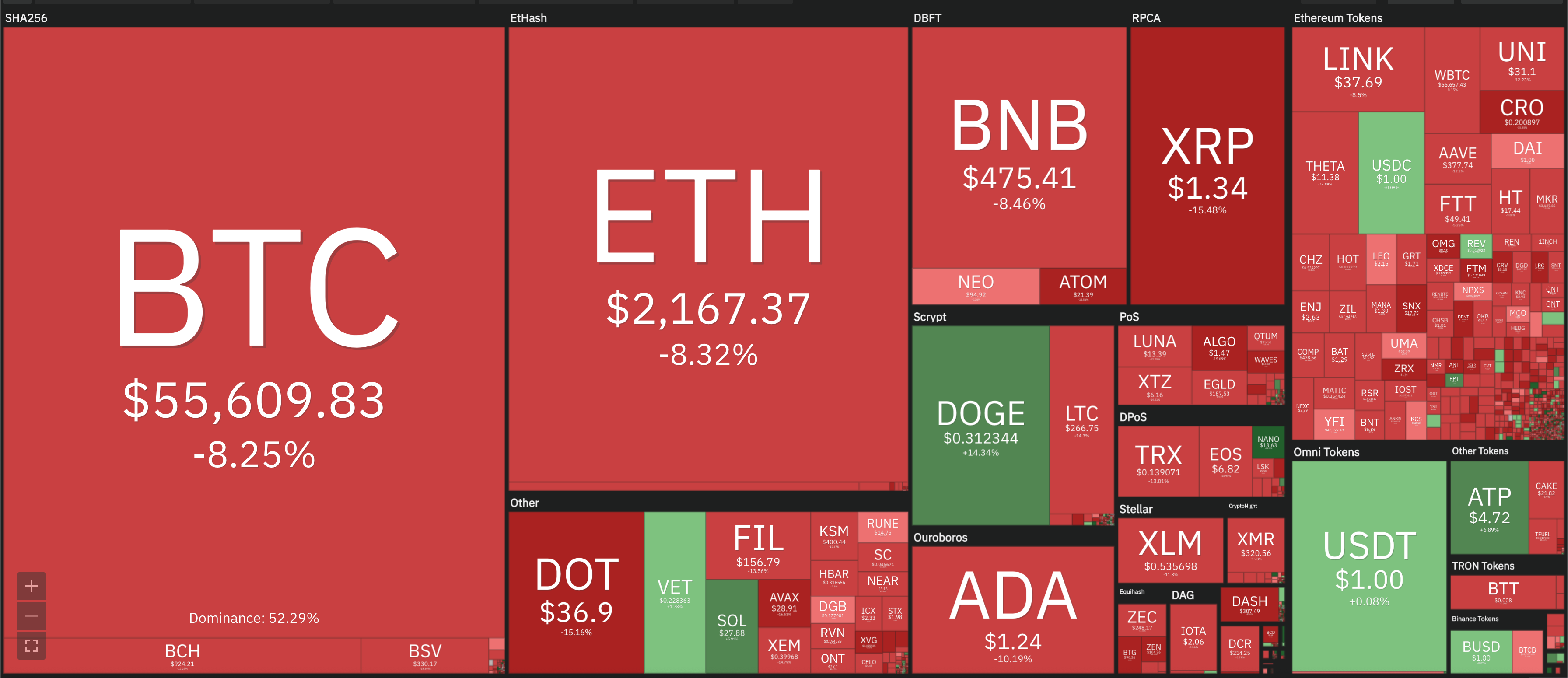 Over the weekend Bitcoin crashed from ~$62.5k/BTC to a low of ~$50.6k/BTC before recovering to stabilize around $55.6k/BTC - a ~20% drawdown, mostly over the course of a single hour. Things were equally ugly for the rest of the cryptocurrency market - except for DOGE, obviously.