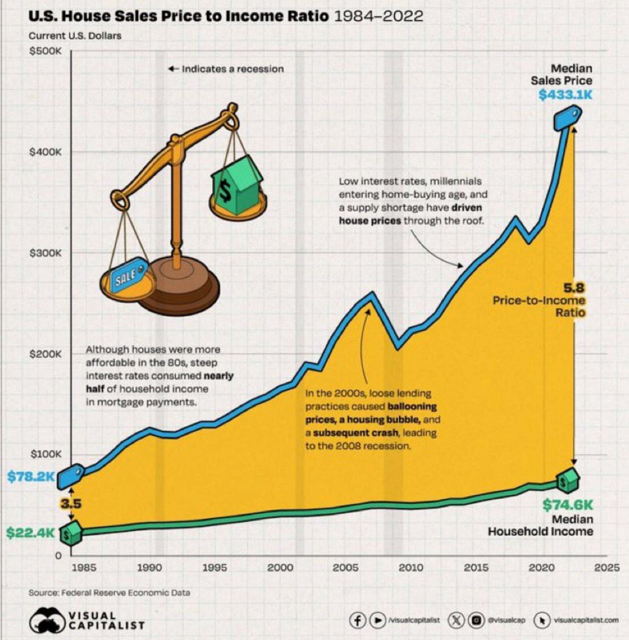 In 1985, the median household income in America was ~$22.4k/year and the median home price was ~$78.2k, meaning the median home cost ~3.5 years of work. By 2022 the median household income had risen to ~$74.6k/year — but the price of the median home had risen even faster to ~$433.1k. Buying a home now took ~5.8 years of work.