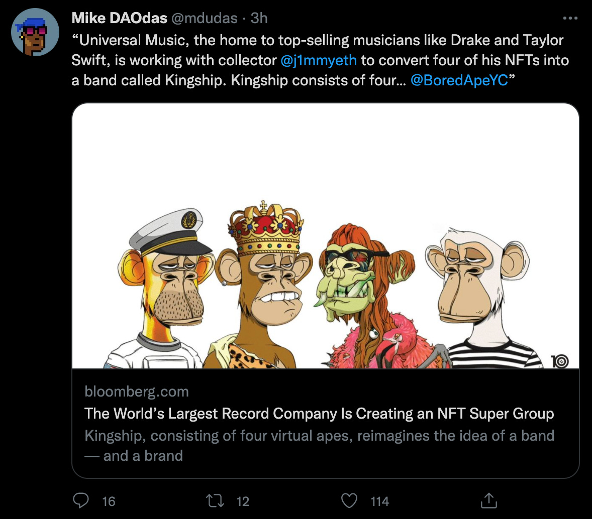 Digital artist Beeple (who we’ve talked about a few times before) recently made another major NFT sale — a piece titled Human One that sold for ~$29M. It’s a seven foot digital sculpture of an astronaut walking through various landscapes that the artist will add to throughout his lifetime. He appeared on The Tonight Show with Jimmy Fallon to talk about the sale and Jimmy Fallon mentioned he had just bought his own first NFT — a bored ape:
