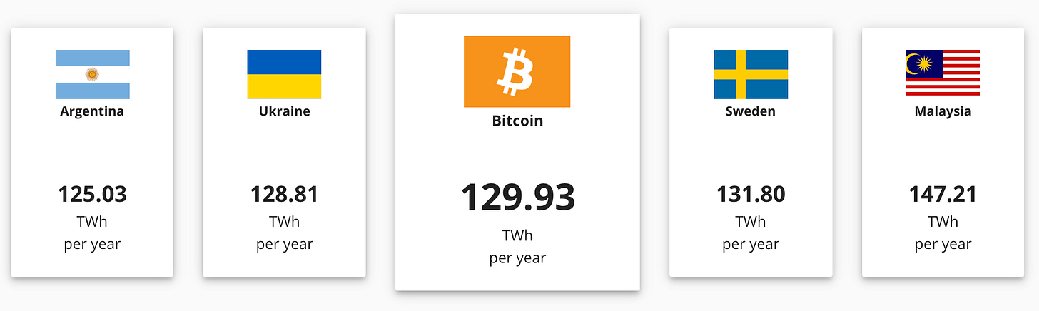 We first discussed Bitcoin’s energy use in our deep dive on Bitcoin mining back in January. If you are curious about why Bitcoin uses so much energy, I recommend starting there. Because Bitcoin does use a lot of energy - at time of writing Cambridge University estimated Bitcoin was using ~0.5% of the world’s energy, slightly more than the Ukraine and slightly less than Sweden.