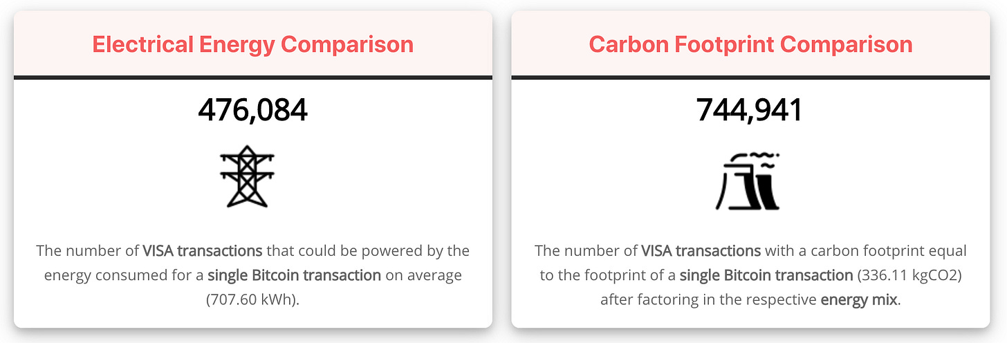 Even beyond transactions comparing Bitcoin to Visa is a misunderstanding of the problem that Bitcoin is intended to solve. Bitcoin is not a payment system, it is a sovereign monetary policy and settlement network. Visa depends on SWIFT, Fedwire, ACH, the Federal Reserve and ultimately the USD itself to function - and each of those layers take energy to operate. A fair comparison would need to account for all of it - including some share of the energy footprint of the US Military.