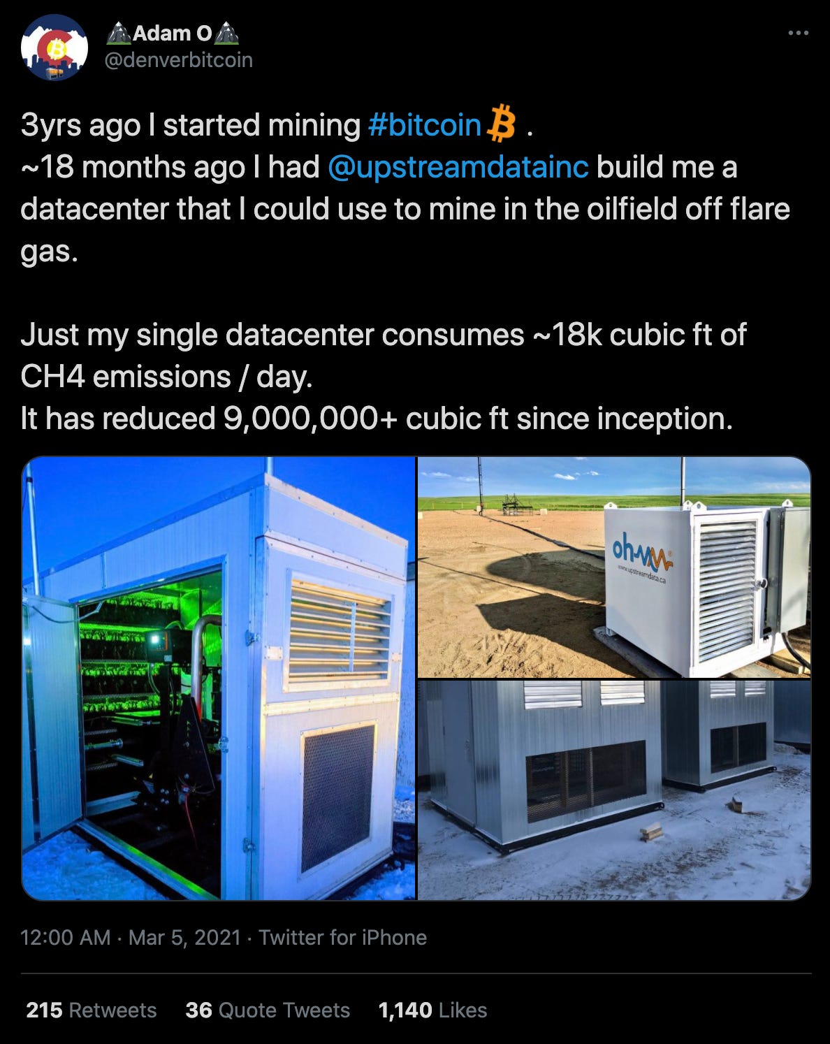 Another great example of this kind of energy use is gas venting. Oil miners often produce natural gas as a byproduct too far from energy markets for it to be profitable to sell. In the past these vents would be burned rather than put to any productive use - but now portable Bitcoin mining centers are appearing and taking advantage of the stranded energy while also reducing the environmental impact: