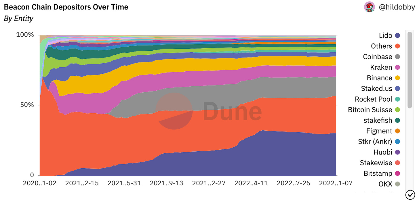 We’ve talked before about the threat of liquid staking and the risk that network effects will naturally cause staked capital to accumulate under one or two validators and effectively centralize the network. It’s probably too early to make predictions about the long term trends here but the inexorable growth of Lido has at least slowed down since we wrote about it in June. At time of writing the top three validators (Lido1, Coinbase & Kraken) control ~52.3% of staked ETH.