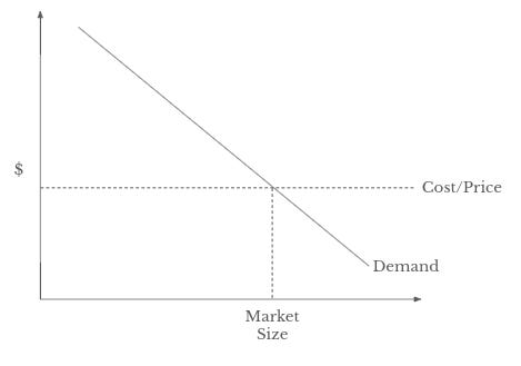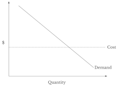 There are a few things we can reason as being true for nearly every firm in nearly every market: if the good/service a firm produces is priced more cheaply demand will go up, and there exists some minimum cost-per-unit that the price cannot fall beneath or the firm won’t be able to cover its costs. Visually economists represent these constraints like this: