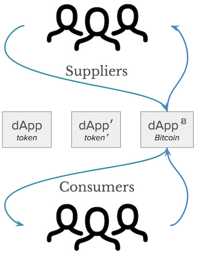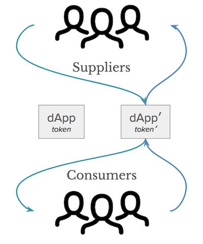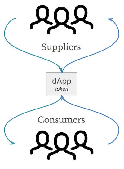 A typical dApp ecosystem is a marketplace connecting buyers and sellers. In Ethereum for example this marketplace connects consumers seeking to run smart contracts with suppliers willing to validate them. For a hypothetical dApp that looks something like this: