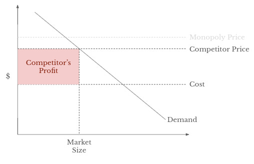 The green area above the cost line represents profit (or to an economist, rent) and is the source of the wealth that accrues to the owners of the company. A nice situation if you can arrange it! But what happens if someone else enters the market? Knowing they are too late to charge the monopoly price, they will undercut it by just enough to steal all of the first company’s customers (and create a few new customers interested in the lower price point) while still maintaining a healthy premium of their own.
