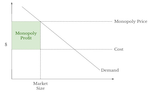A monopoly firm that faces zero competition has the freedom to choose any price it wants for it’s products and will obviously choose the price that results in the greatest possible profit — this premium price will sell fewer units on average but will make up for it with a large profit margin on every item. This is how that looks on our graph: