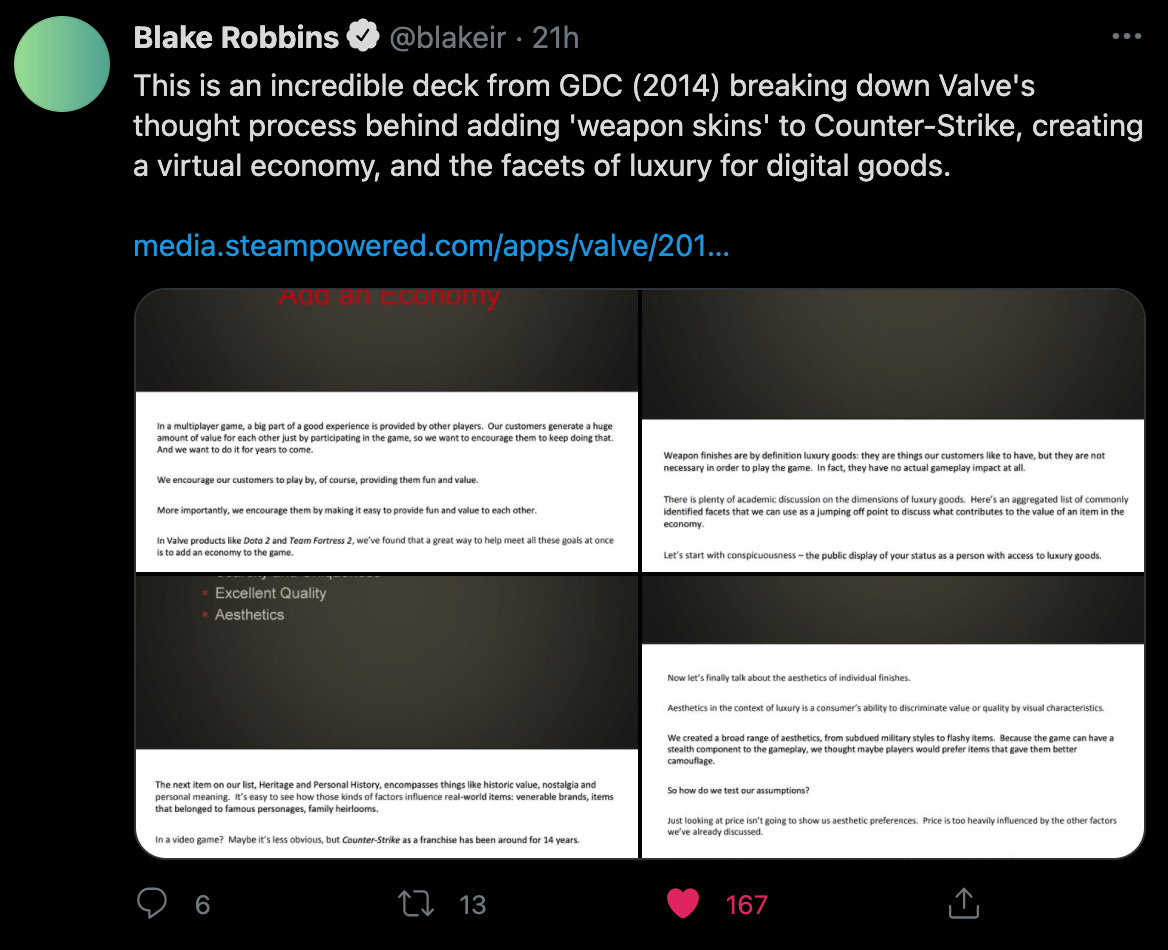 Weapon skins from Counter-Strike: Global Offensive (CS:GO) are one of my favorite examples for helping people understand why digital objects like NFTs can carry real value. This presentation by Valve about how to create an economy around luxury goods was written in 2014, before NFTs existed - but it is a terrific lens by which to understand which NFTs gain traction and why.