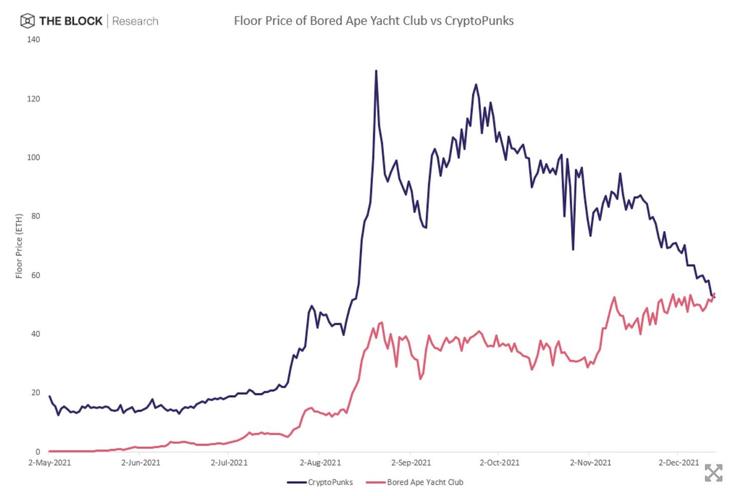I don’t really see any reason for this trend to reverse. CryptoPunks are a finished art project and Bored Apes are a living fashion brand. The appeal of CryptoPunks is historical — they were the first major NFT project to achieve success and they predate the ERC-721 standard itself. The appeal of Bored Apes is contemporary — they throw parties, they do airdrops, they have a roadmap.