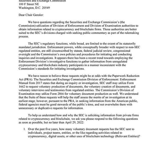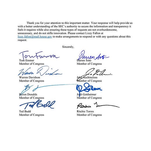 Representative Tom Emmer (R-MN) and seven other congresspeople from both parties signed a letter scolding the SEC for having an "overburdensome" regulatory approach to crypto and asking a series of pointed questions about the requests it is making of cryptocurrency companies.