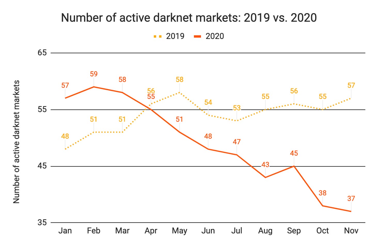 The pandemic has been tough on everyone but truly the hardest hit have been the drug dealers. Quarantines across the world have drastically reduced the number of parties and hence killed demand for party drugs. At the same time costs have soared as travel restrictions disrupt their supply chains. People are smoking more weed but most weed isn’t purchased on the darknet markets because it’s bulky and smelly to ship and usually available locally (often legally). Darknet markets are also just as affected by the delays and errors in shipping that have plagued the postal system this year. The result is the number of darknet markets is decreasing for the first time since 2016: