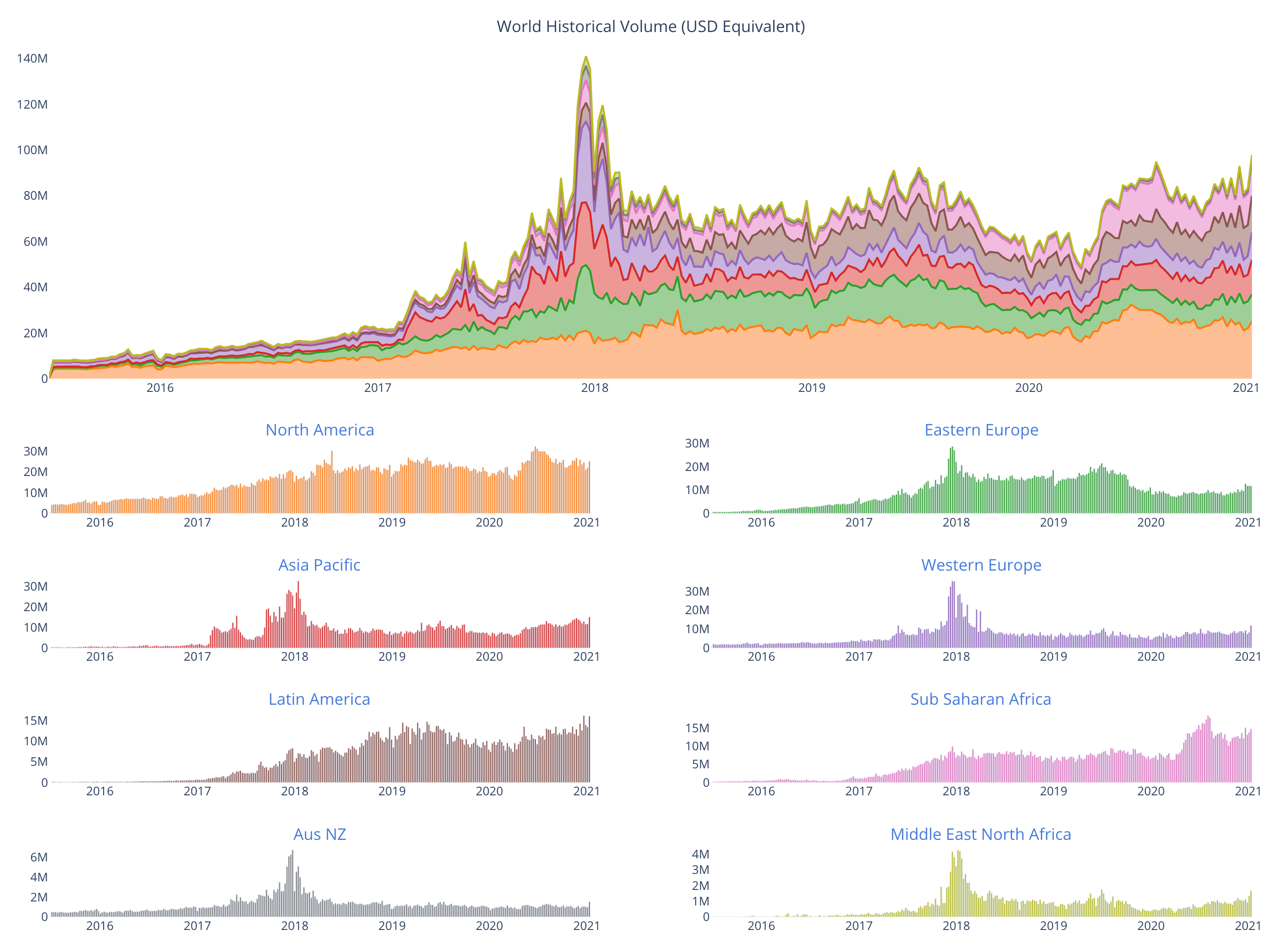Another interesting metric to watch is the trading volume on peer-to-peer exchanges like Paxful and LocalBitcoins which operate less like Coinbase and more like Craigslist - you make individual trades with other individual humans. It’s not as efficient at price discovery but there are some advantages: you don’t need a bank account, you don’t create a paper trail. Paxful has said in the past that many of their users are sex workers who use bitcoin essentially as cash. Usage of peer-to-peer exchanges has risen to a 3 year high but hasn’t yet returned to 2017 peaks: