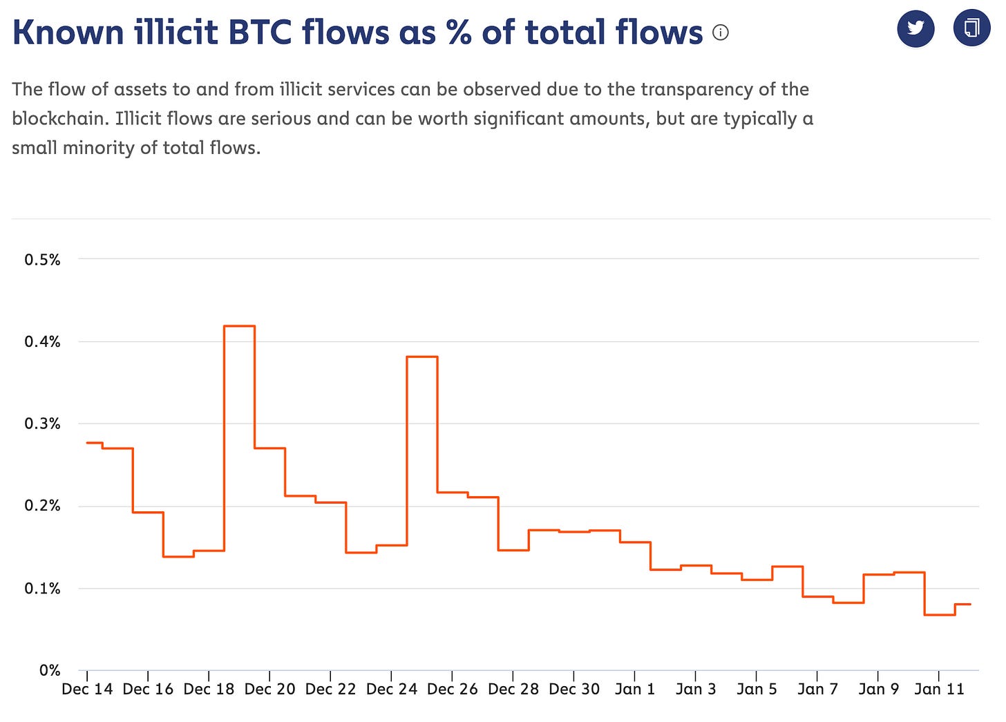 Bitcoin has grown a lot since then though and darknet markets while they still exist have not grown the same way. Chainalysis (a company that does this kind of transaction analysis) estimates that 'illicit transactions' currently represent <0.1% of all bitcoin flowing through the system. Large enough to represent serious value but still small relative to the entire Bitcoin network. (More on darknet markets below!)