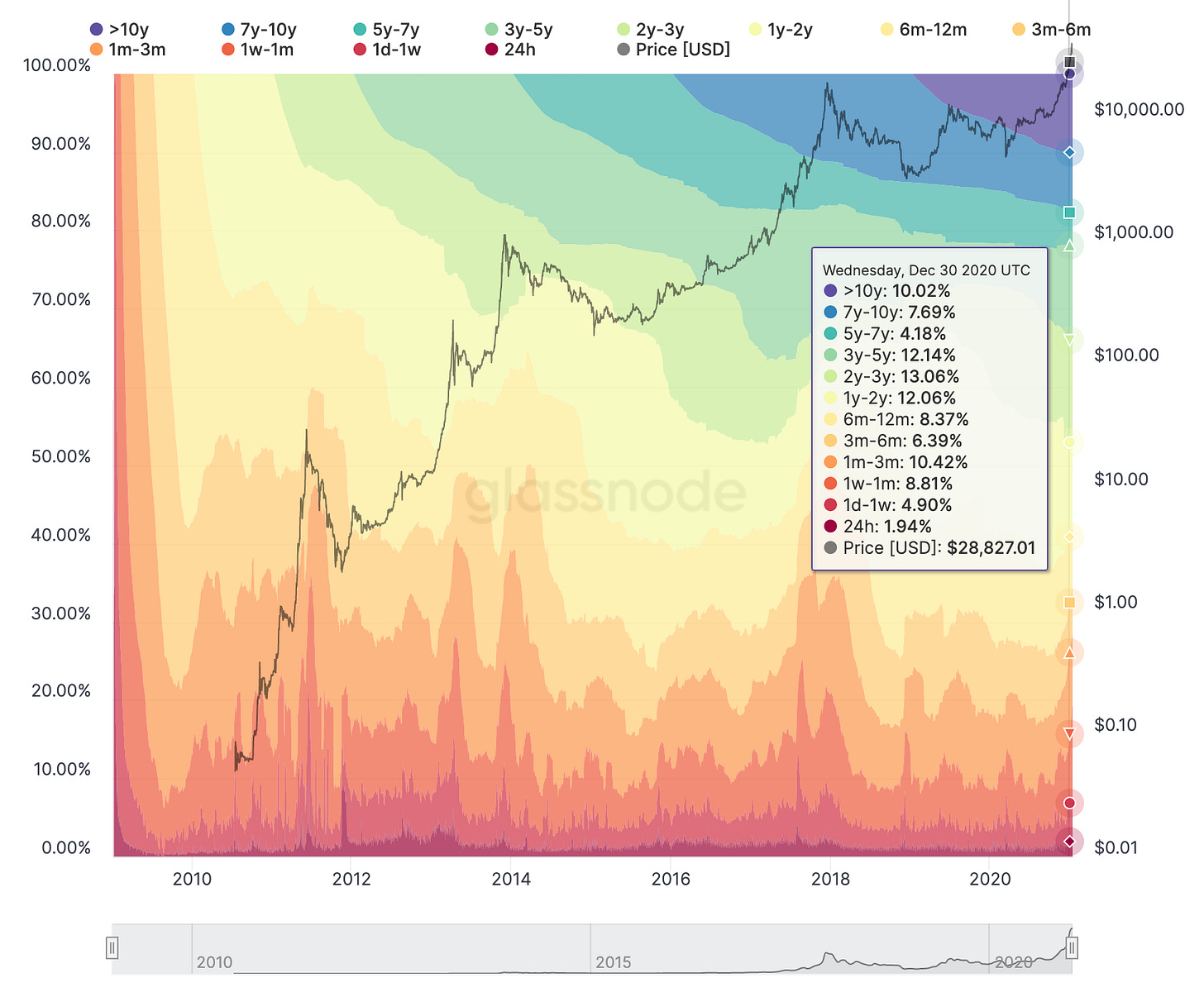 The first thing we can say is that most Bitcoin don’t actually move very often - only ~40% of Bitcoin moved at all during 2020. In fact, ~21% of all bitcoin haven’t moved in the last 5 years (when the price was ~$500/btc).