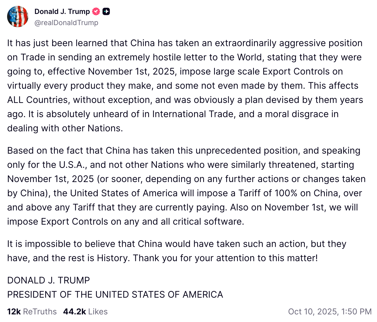 On Friday afternoon, U.S. President (and America’s most popular pedophile) Donald Trump announced his intention to raise tariffs on Chinese imports another 100% on top of existing tariffs. Reopening the global war on trade for no particular reason1 surprised the market, knocking roughly 2.7% off the S&P 500, 2% off the Dow Jones and 3.5% off the Nasdaq 100.