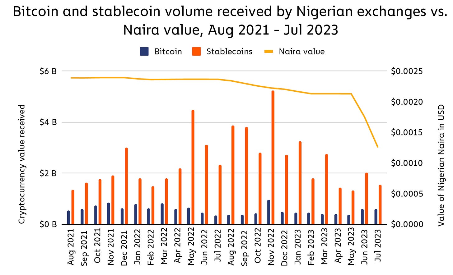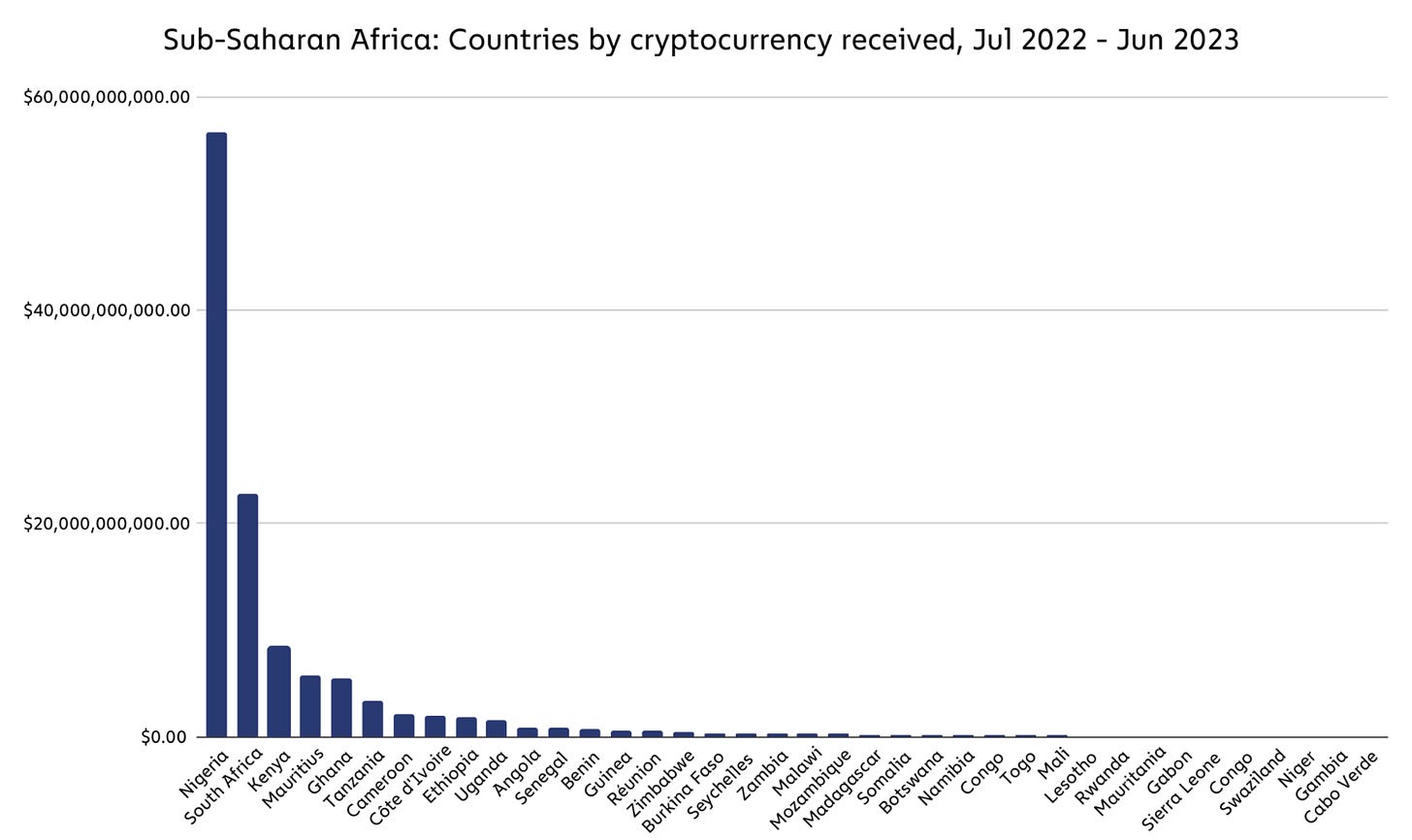 There are ~213 million people in Nigeria. According to Chainalysis their usage of crypto payments has been growing ~9% annually, the third fastest in the world after Saudi Arabia (~12%) and Vietnam (~11%). More than a third of all Nigerians have started using Bitcoin and stablecoins (mostly Tether). Compare that with the Nigerian government’s eNaira cryptocurrency, which has only ~0.5% adoption.