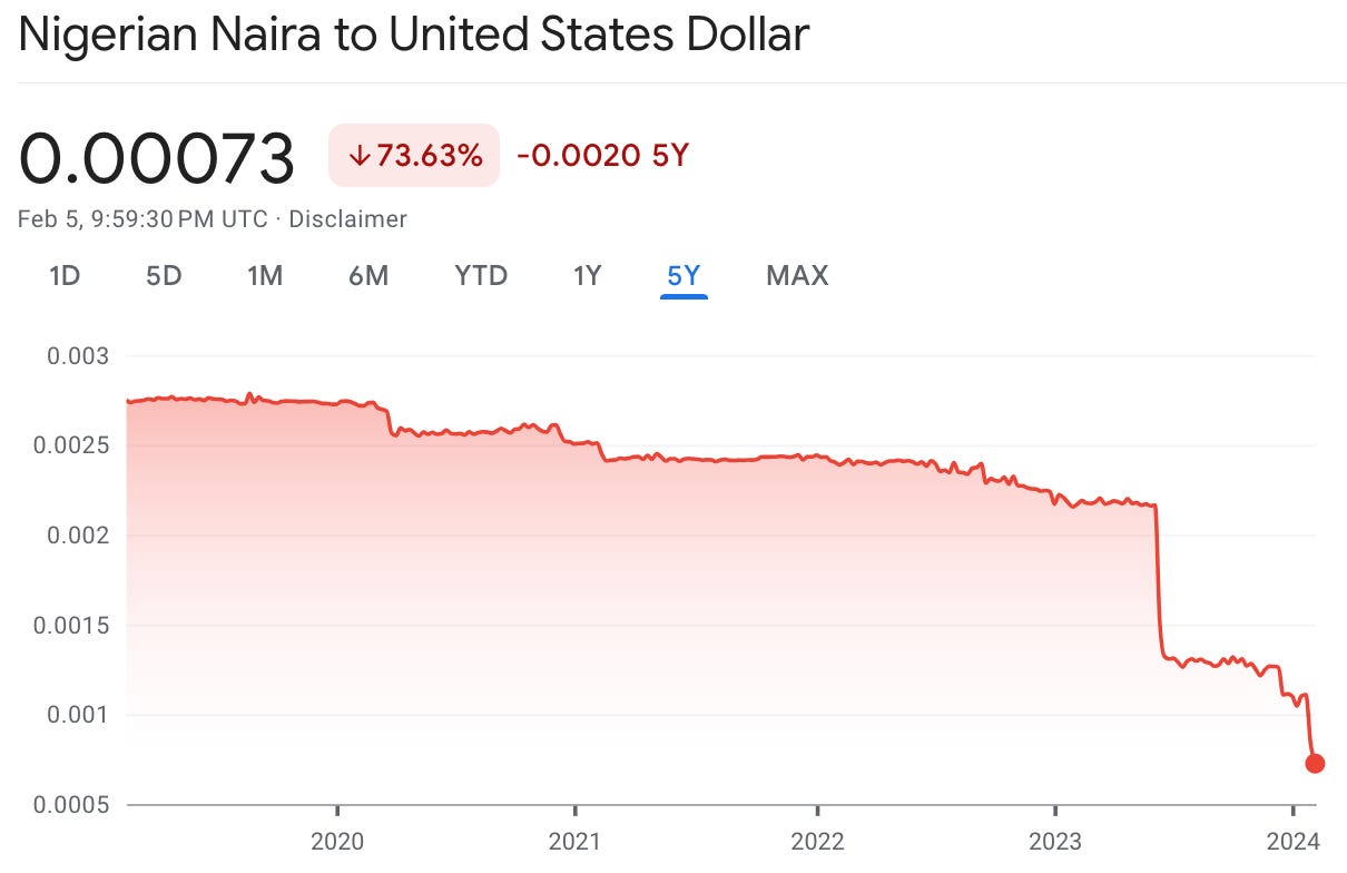 The first time I mentioned the Nigerian naira on Something Interesting was in January of 2021 in an answer to a reader submitted question about how people actually use Bitcoin in practice.1 At the time $1 USD could buy ~₦400 NGN. Last month we talked about the naira again when the government of Nigeria relaxed many of its previous restrictions on the use of cryptocurrency in commerce. By then $1 USD could buy ~₦900 NGN. As of writing $1 is currently worth ~₦1370 NGN.