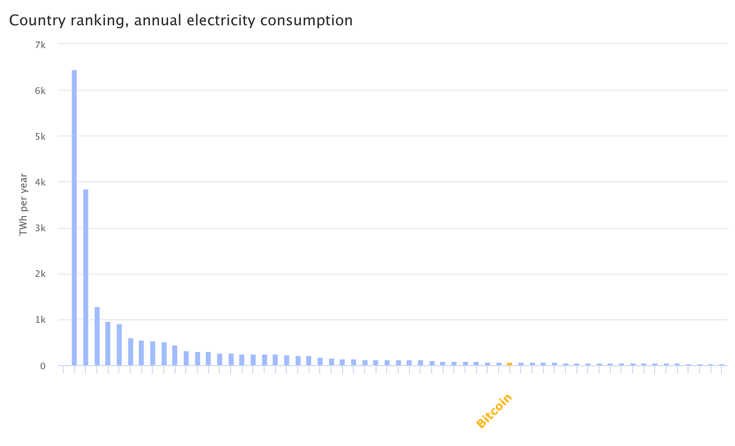 Currently the CBECI estimates that Bitcoin is using ~70.5 TW/year, with a lower bound of ~26.4 TW/year and an upper bound of ~177 TW/year. (That’s the equivalent of estimating the number of US States at somewhere between ~13 and ~87). At ~70.5 TW/year Bitcoin mining would represent ~0.32% of the world’s energy use, slightly more than Colombia and slightly less than Bangladesh.