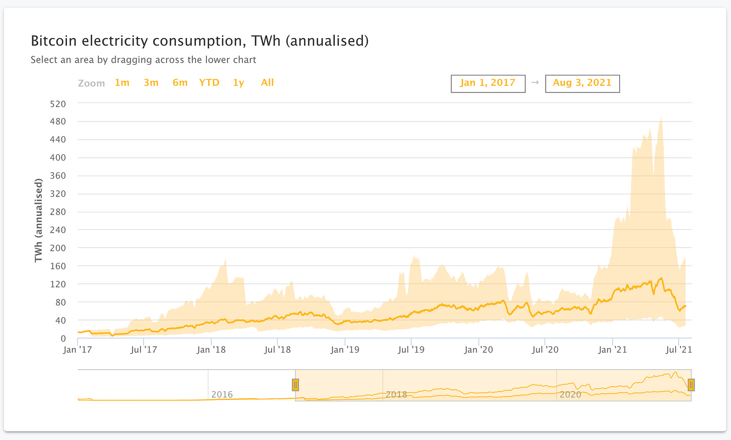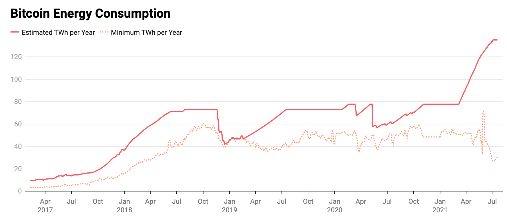 In my opinion the current best model for estimating the energy use of the Bitcoin network is the Cambridge Bitcoin Energy Consumption Index (CBECI). CBECI’s report comes from a coalition of mining pools representing ~32-37% of the hashrate. The data is still ultimately self-reported but the level of transparency is much higher and the people preparing the report are an academic group rather than an industry advocacy organization. Unlike the Digiconomist their models were quite responsive to the seismic shifts in the industry as they were happening: