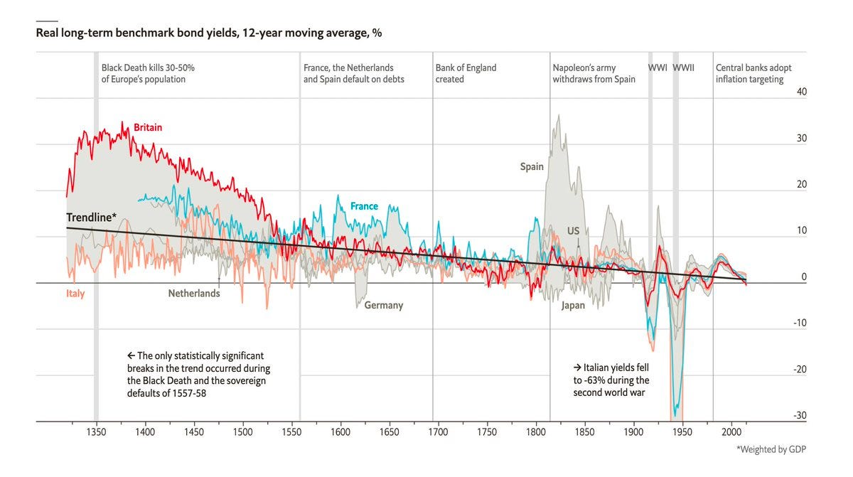 This incredible graph from The Economist shows that the long downward trend in interest rates for government debt goes back as far as 1350. In other words governments have been lowering interest rates (and hence devaluing money) since literally the Black Death. The inflection point we are hitting at zero and near zero interest rates has been building for centuries.
