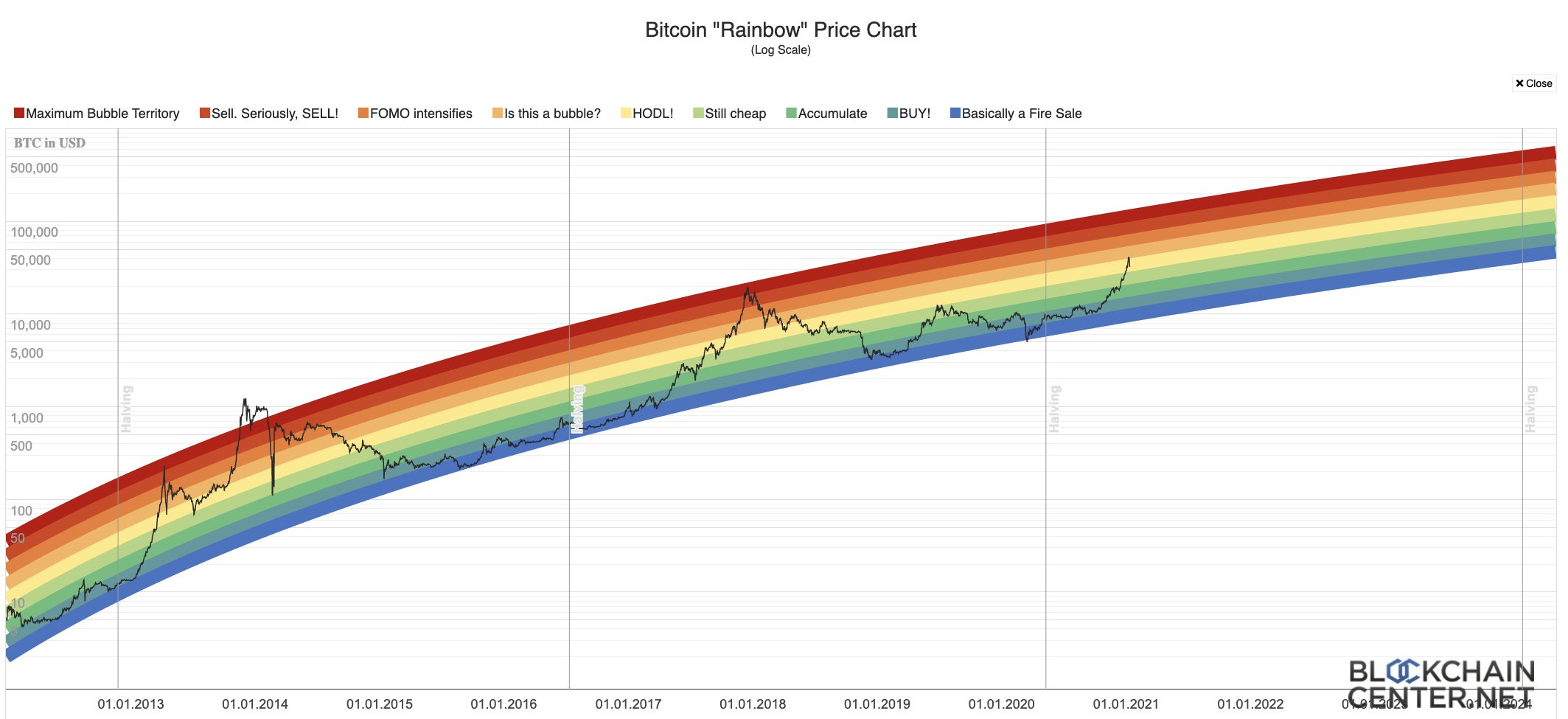 Now that we have all ridden the Bitcoin rollercoaster a bit this week, let’s talk about dips. A drop of ~$12,000 in a few days is in some ways a startling move (I’m sure it was for newcomers to the space) but in other ways it is completely in character. So far at least this particular lurch is relatively middle of the road in terms of typical corrections downward in past Bitcoin bull markets. If you zoom out a bit that is more obvious. Here is the drop in the context of our long term rainbow graph above: