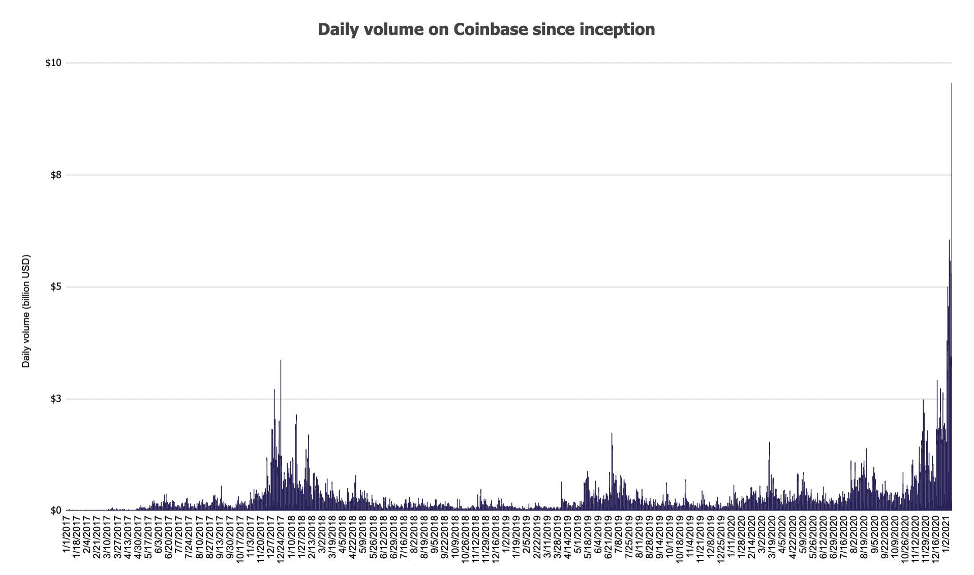 The volatility may be making new holders nervous but the exchanges themselves are making money hand over fist. Exchange revenue is mostly from trading fees, so they make money on rapid movements whether the price moves up or down. Coinbase cleared more volume on Monday than they did in Q1 of 2019. These are absurd growth numbers to be going into an IPO with - one imagines the hype will probably attract new investors to the entire crypto asset class.