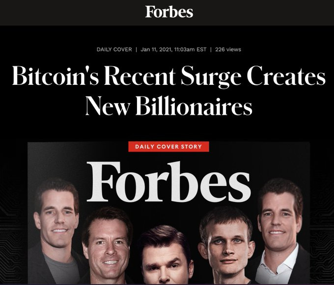 Forbes published a glowing profile of Bitcoin billionaires at 1/11/2021 at 11:00 am PST when the price had crashed ~25% down in the last 24 hours. Seems likely at least some of those billionaires lost their title between writing and publication.