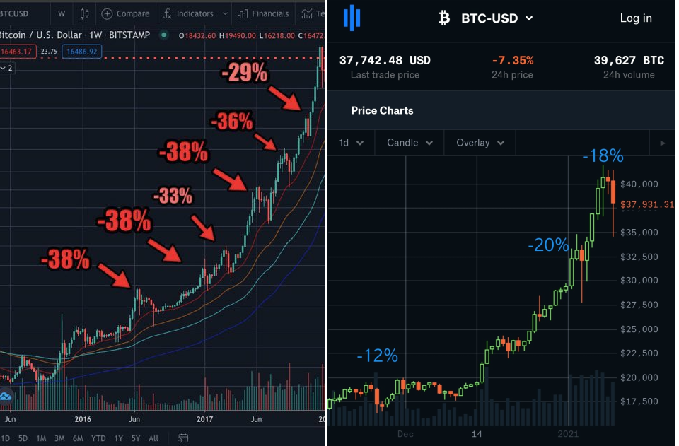 If we compare the drops so far with the drops on the previous run up they are actually relatively modest so far. Pictured below are the 2017 dips on the left and the last two months or so on the right. This is why experienced Bitcoiners are unalarmed. This actually isn’t that big a drop yet.