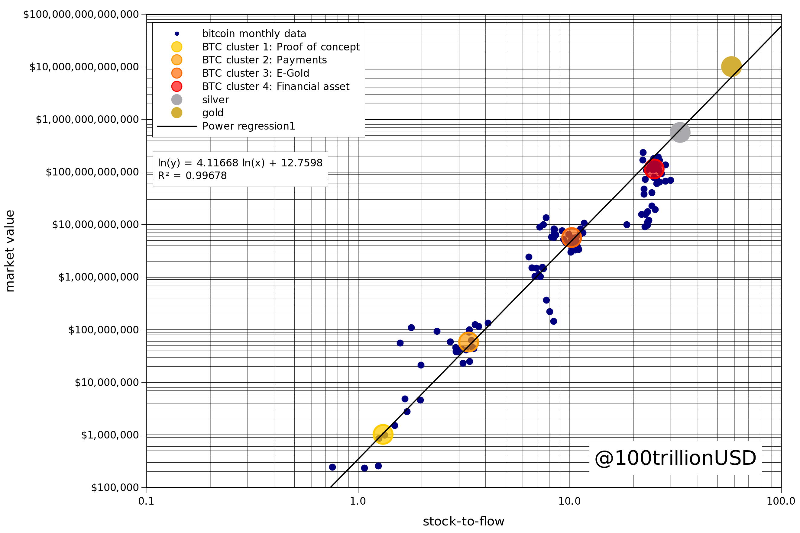 Another more mathematically sophisticated model is @100trillionUSD’s stock-to-flow model, which pretends that Bitcoin is a precious metal and then models the price by comparing it to the ratio of stock (how much Bitcoin already exists) to flow (how much Bitcoin is being mined today). Stock-to-flow is an attempt to quantify Bitcoin’s scarcity and to see how the halving (the process where mining rewards are cut in half every four years) affects price. The resulting prediction looks like this: