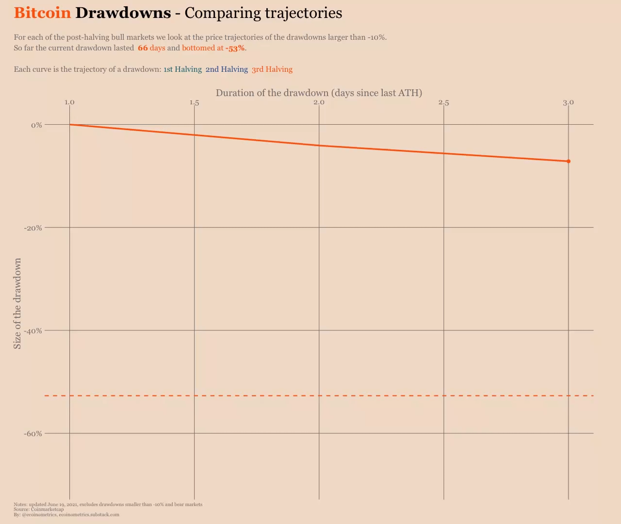 There have been a number of drops throughout Bitcoin’s history more severe than this one, but only a handful have lasted this long. The first line in this animation is this dip so far:
