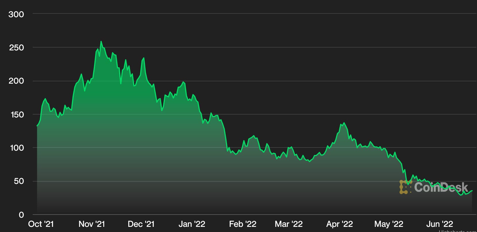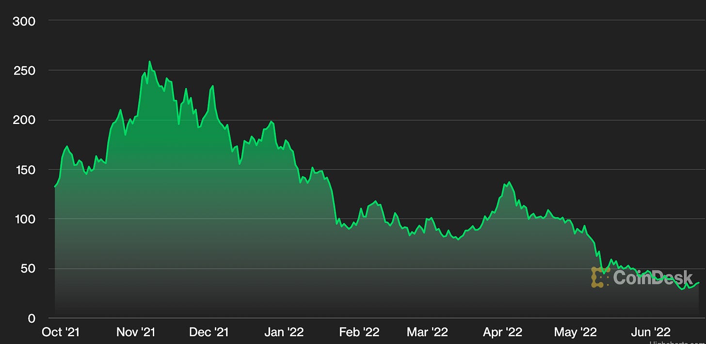 Ethereum competitor and smart contract platform Solana has also been hit by the broader market malaise, marking a new all time Solan-low of ~$27/SOL last Wednesday, though it has since recovered and is currently trading at ~$34/SOL. That’s a pretty strong last week or two but it has still been a pretty tough market cycle for Solana overall: