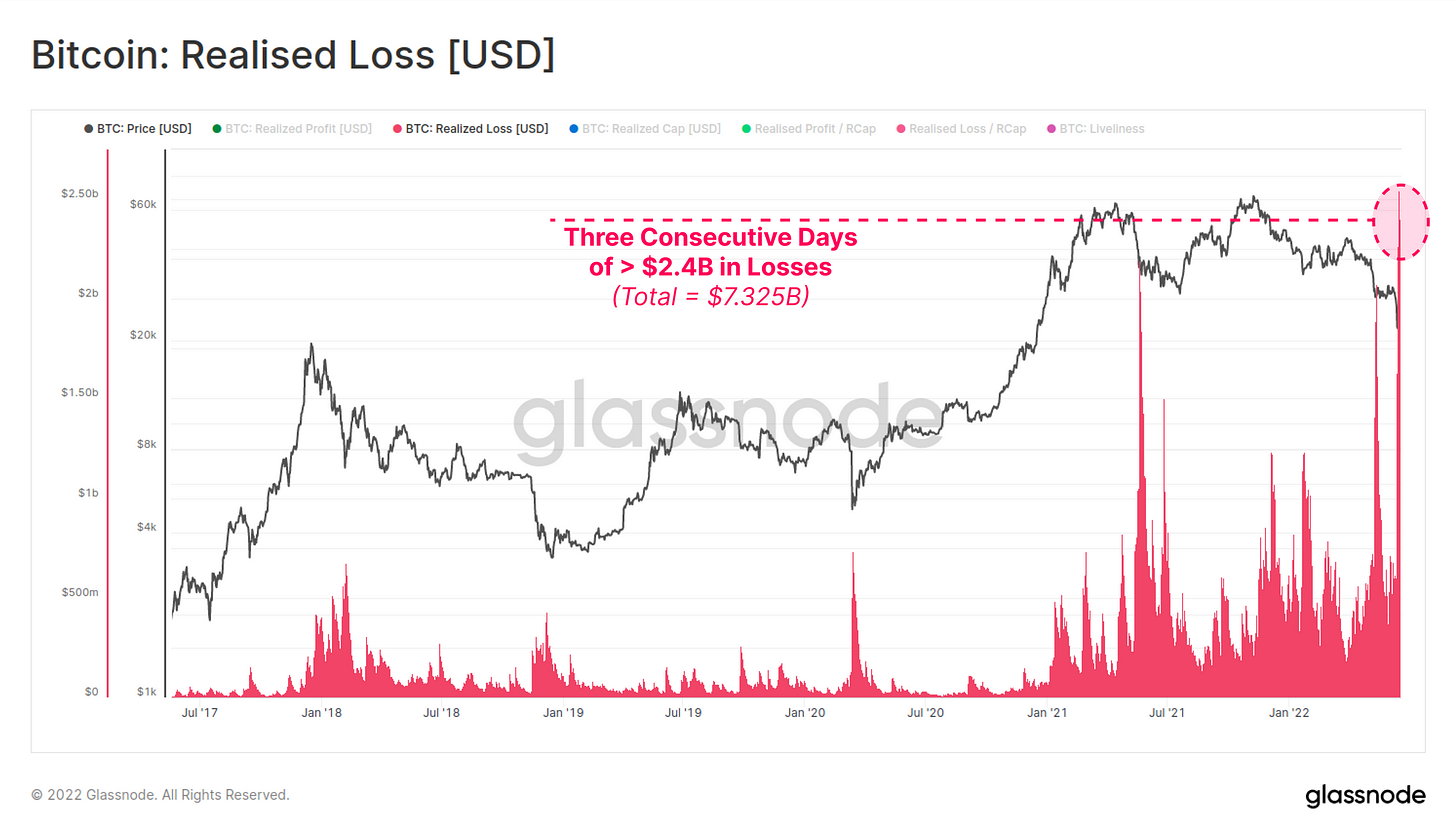 The drop shook the confidence of (some) long term holders, who collectively sold around ~178k bitcoin — including a number who bought in at the previous all time high of ~$69k/BTC in 2021. More than ~0.5M BTC changed hands, locking in the largest USD losses in Bitcoin history (~$7.3B):