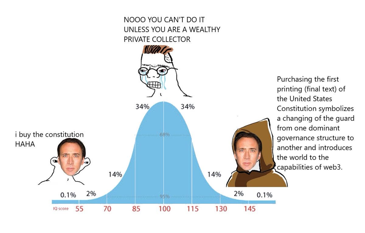 On Thursday November 18th Sotheby’s Auction House will be selling one of the eleven remaining original copies of the U.S. Constitution - estimated value $15-20M. In response to this occasion a group calling themselves @ConstitutionDAO has started organizing a meme-movement on Twitter and Discord ultimately aimed at fundraising enough money to win the auction and buy the constitution "on behalf of the people."2