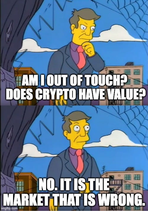 This is a dusty old argument — I actually wrote about it in the second issue of Something Interesting and it was already old back then. It’s wrong in a bunch of ways but I don’t know that it’s worth rehashing them all here. Instead I think it’s useful to take a step back and ask a simple question. If crypto is intrinsically worthless, why hasn’t it collapsed already? What has changed?