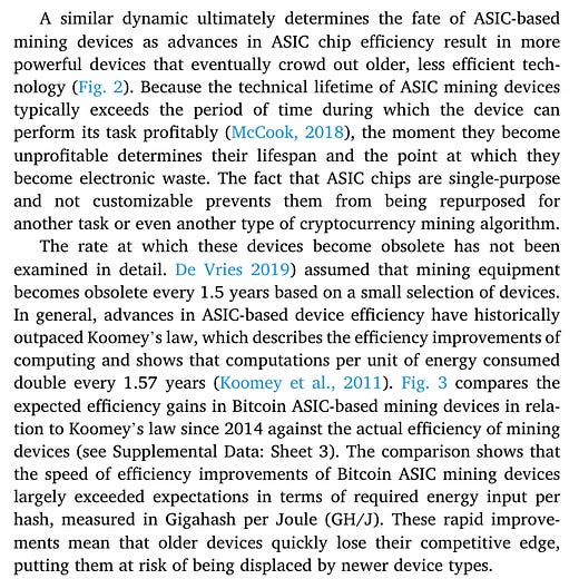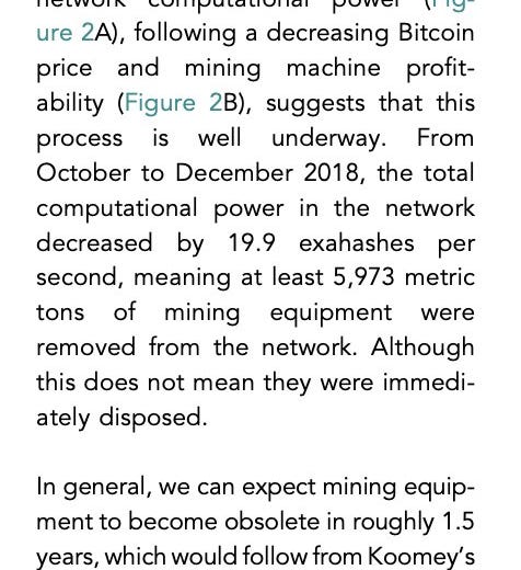 Public mining companies record their depreciation for mining infrastructure over 3 years and report that in practice it is usually longer. After that mining equipment that becomes uncompetitive isn’t retired it is sold to a miner with access to cheaper power (this is known as life-cycling). Finally mining equipment is almost entirely aluminum and contain no batteries and few toxic metals — so they are generally fairly easy to recycle and there is strong financial incentive to do so.