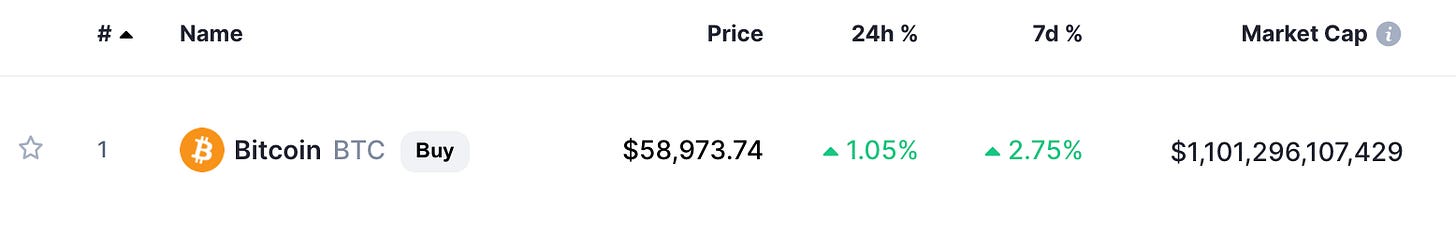 Bitcoin traded last week between the (relatively) narrow band of ~$57-60k, meaning that it spent the entire week trading above a $1 Trillion market cap. That makes Bitcoin the 14th most valuable currency in the world, just behind the Swiss Franc. If Bitcoin were a company it would be the sixth most valuable company in the world, worth more than Facebook but less than Alphabet (i.e. Google).