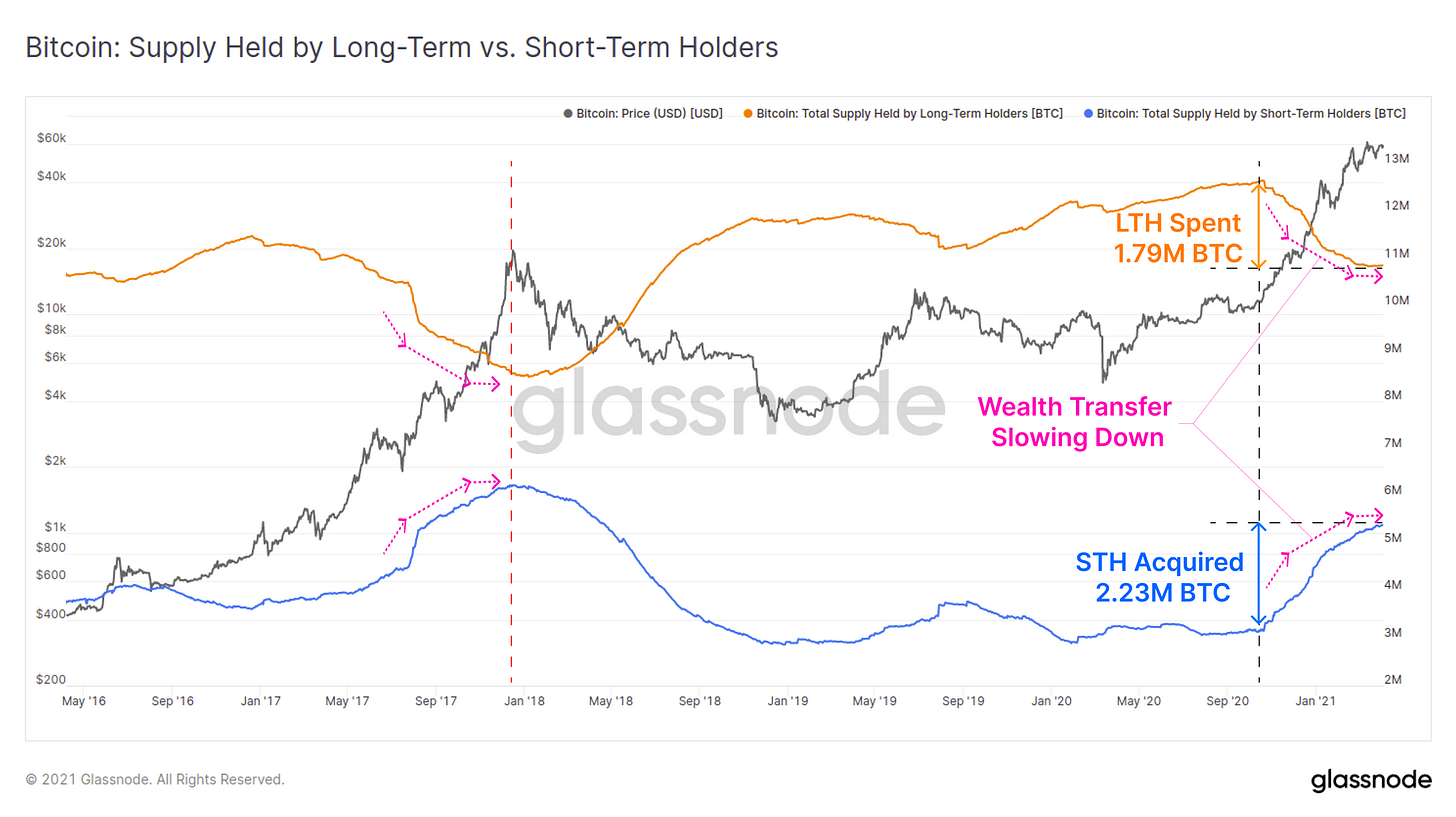 The total bitcoin supply held by long term holders (the orange line in the graph below) is stabilizing, and the growth in total supply held by short term holders (the blue line) is slowing down. That suggests that long term holders (like miners) are expecting more growth in the short to medium term.