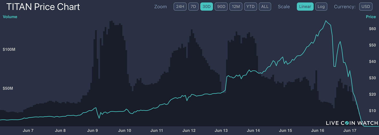On Sunday Mark Cuban published a blog post about his explorations in DeFi with the observation that "valuing tokens is easier … than you think." He mentioned a handful of tokens he owned, most notably TITAN. On Wednesday TITAN dropped from $64 to $0 in a matter of hours. Valuing TITAN is now considerably easier! It’s worthless.1
