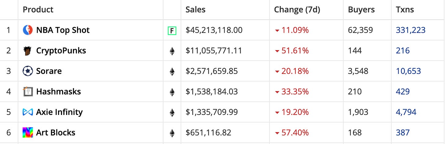 The market for non-fungible tokens (NFTs) may be starting to run out of momentum. Weekly sales volume for top projects have dropped between ~11-57%. The two largest projects (NBA TopShots and CryptoPunks) are seeing sharp downturns in price: